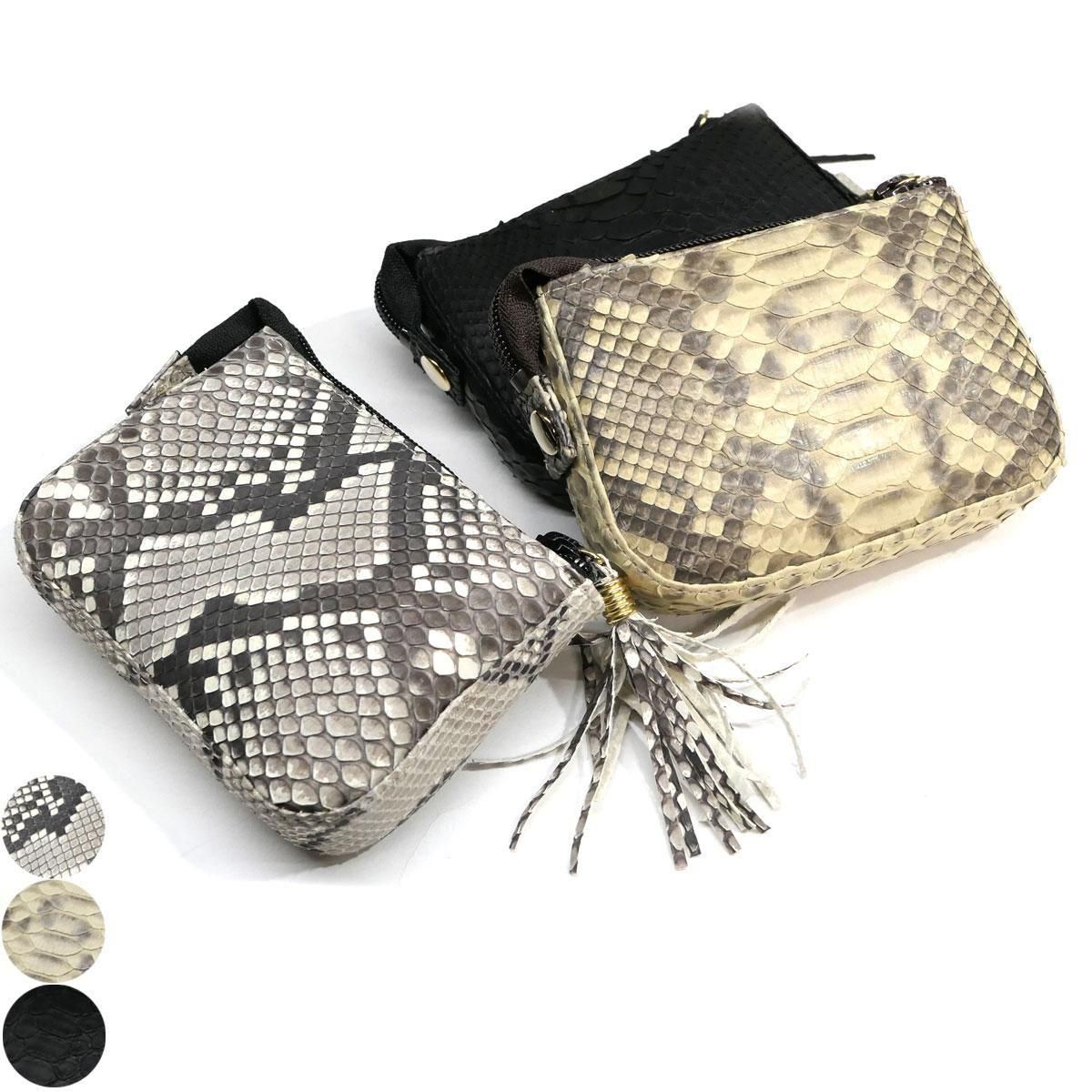天然素材 ダイヤモンドパイソン(ヘビ革)のファスナーポーチ。開閉は本体横幅より長くしたファスナーの為、大きく開き出し入れが簡単です。引き手には、同革のタッセル付き こちらも工房にて作られており1つ1つ違った表情・色合いで天然素材使用ならではの逸品。