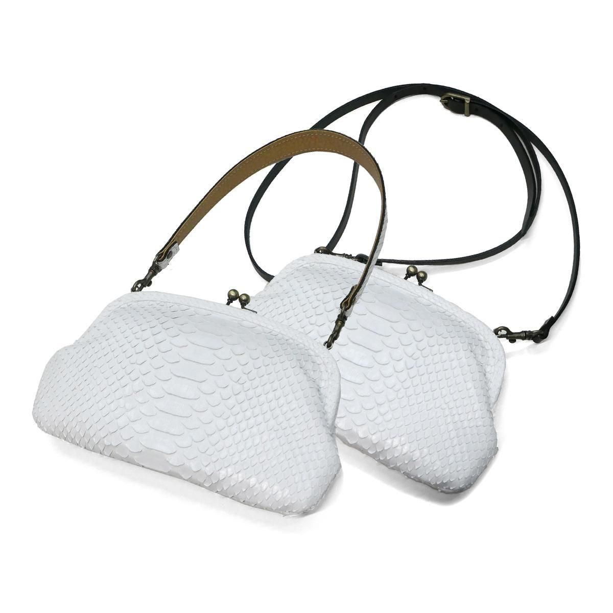 がま口 バッグ 3WAY 横型 ハンド・ショルダーベルト(色選択) 2本付き 本革 パイソン ホワイト