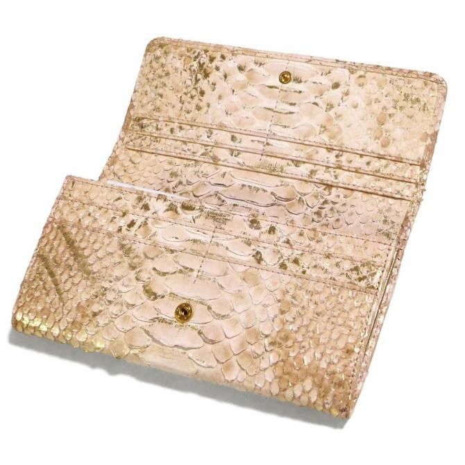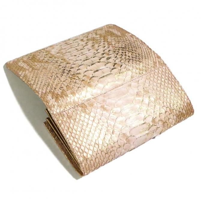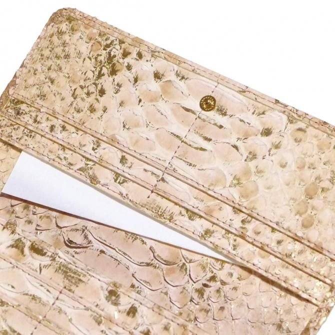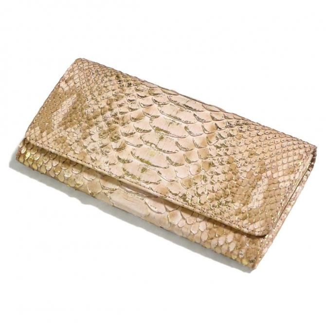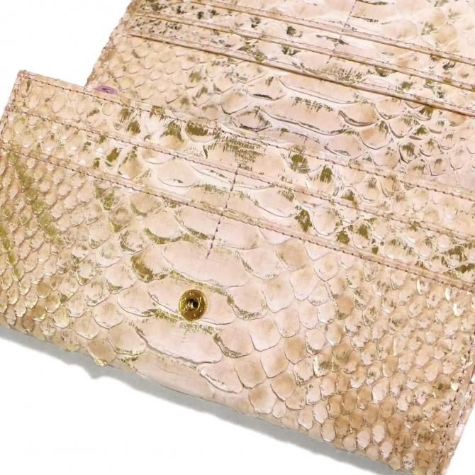 光沢を抑えたマット仕上げのパイソン革に上品なゴールドを施したデザイン性のある素材。艶のない滑らかな表面のパイソン独特のうろこ模様に、ゴールドが光の角度でほのかに輝くその表情は、華やかでありながらも 決して派手すぎず、洗練された大人の装いにそっと馴染みます。