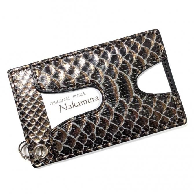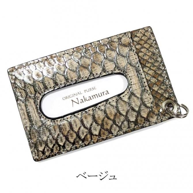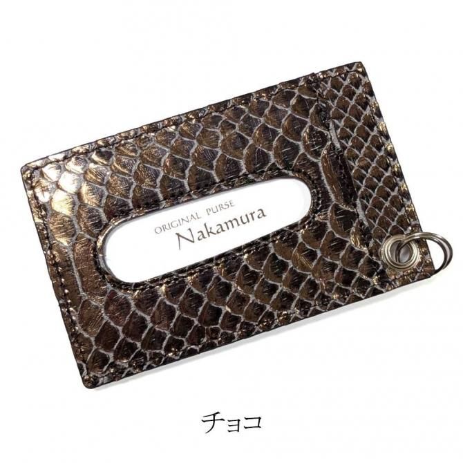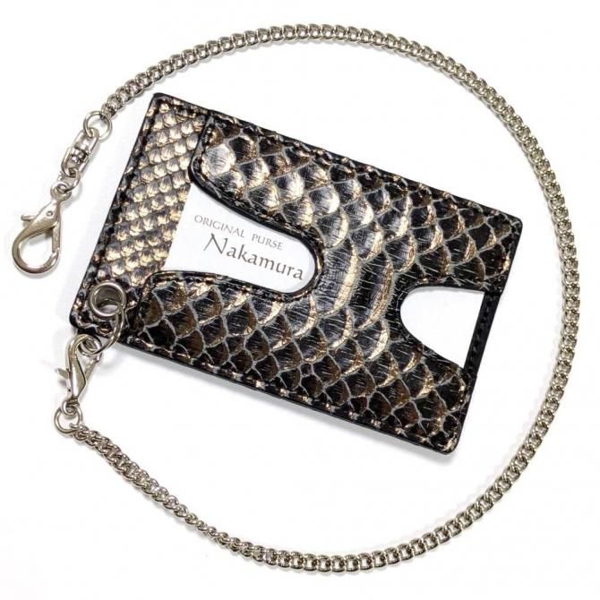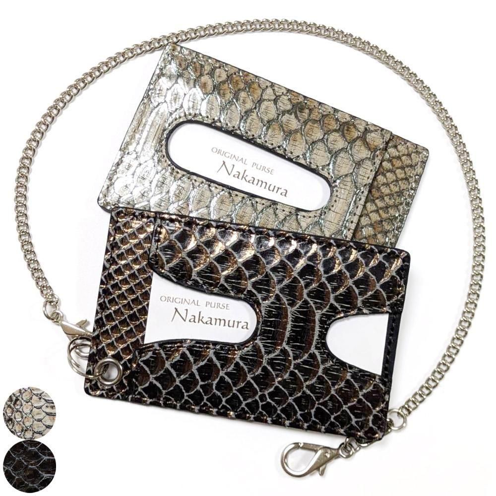 両面パスケース チェーン付き 薄型 定期入れ パス入れ 本革 パイソン ラスター