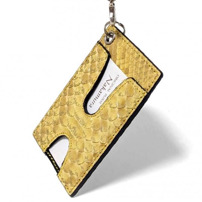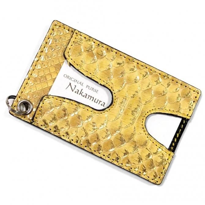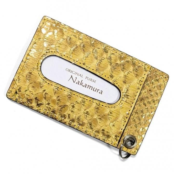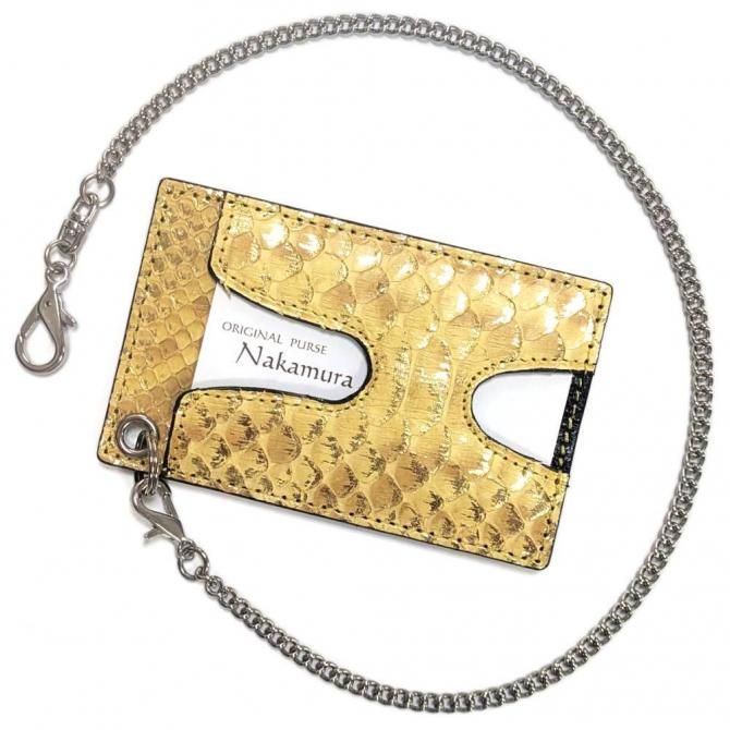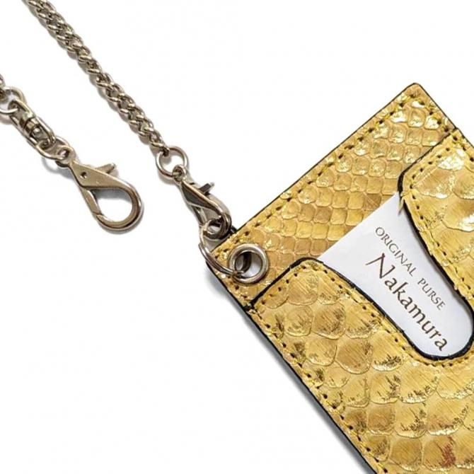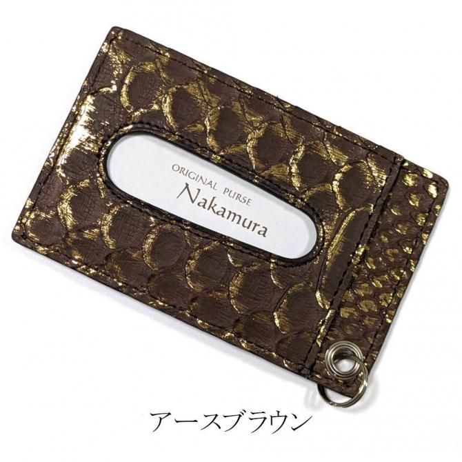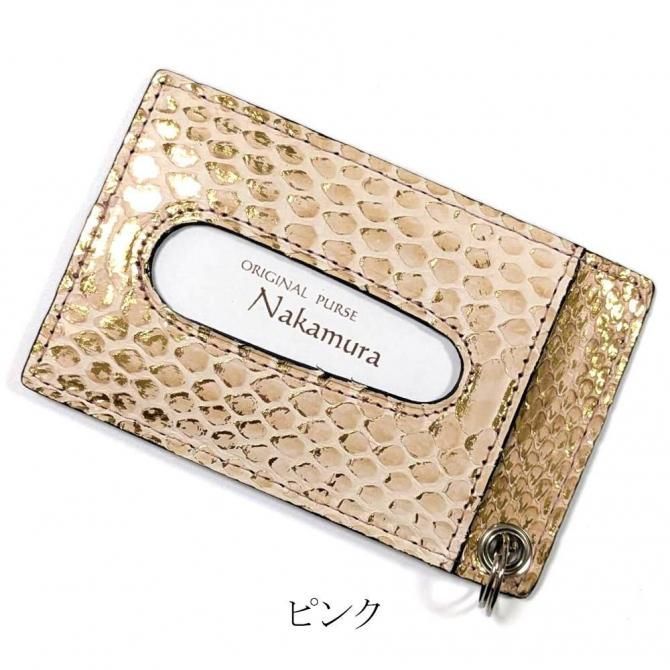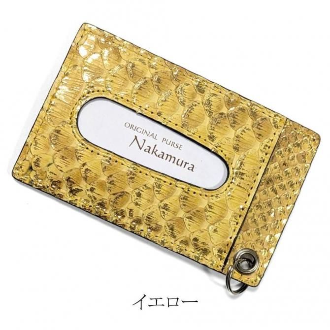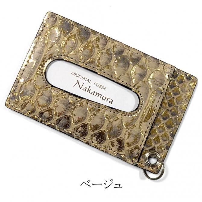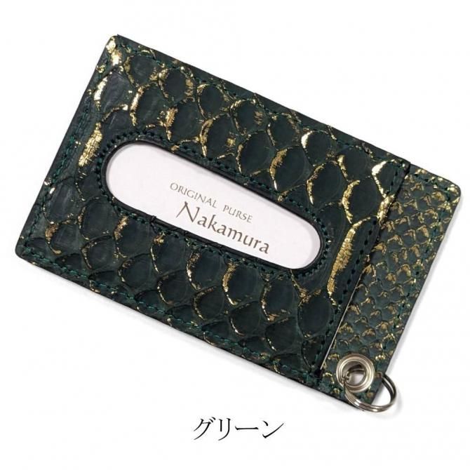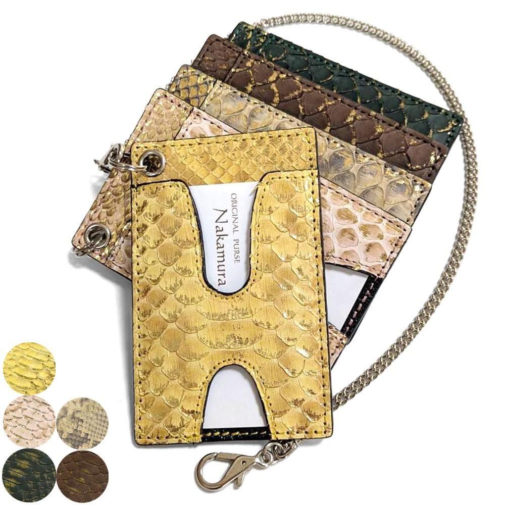 両面パスケース チェーン付き 薄型 定期入れ パス入れ 本革 パイソン リーフ