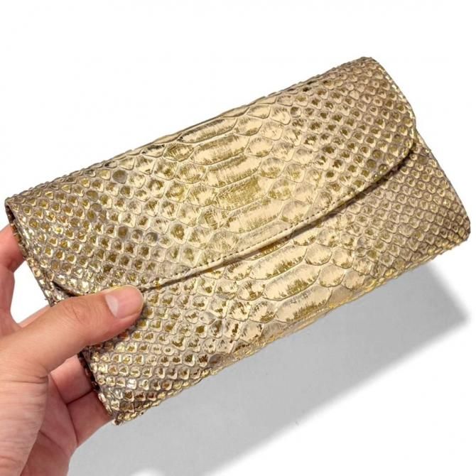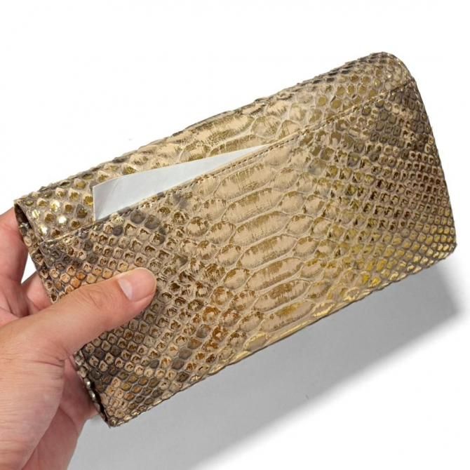 自然が生み出した模様やテクスチャー、他の革素材にはない美しさを持ち、唯一無二の存在感を放つ エキゾチックレザーの一つ、ダイヤモンドパイソン革を使用。 マットに仕上げたパイソン革に、ゴールドの輝きが重なった上質な素材。 パイソン特有の鱗模様とゴールドが光の角度によって繊細に浮かび上がり、上品で洗練された印象に。ひとつとして同じものがない個性が魅力です。 外装・内装の一部にパイソン革を取り入れたデザイン。 天然皮革の風合いや質感を最大限に活かしたものづくりは、他にはない皮革小物専門店ならではの逸品です。 当工房では、革それぞれの特徴や加工、仕上げ、染めを存分に楽しんでいただけるよう、メインとなる革を中心に、パーツごとの機能に合わせた素材選びをしています。そのこだわりの積み重ねにより、使いやすさと長く愛用できる耐久性を兼ね備えたレザーアイテムをお届けしています。