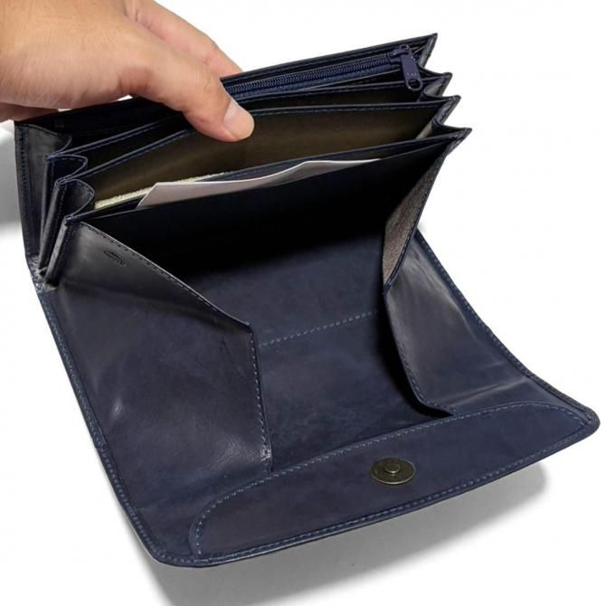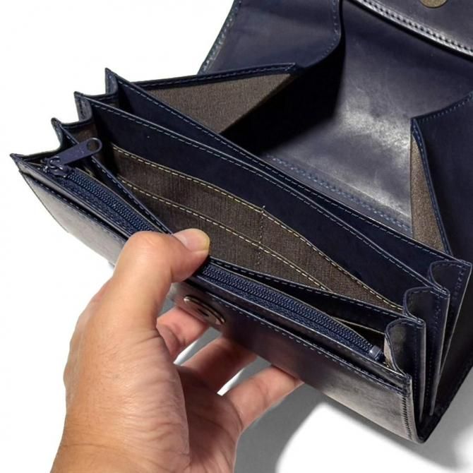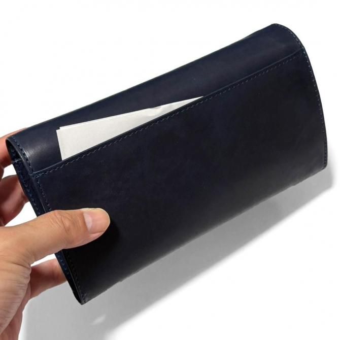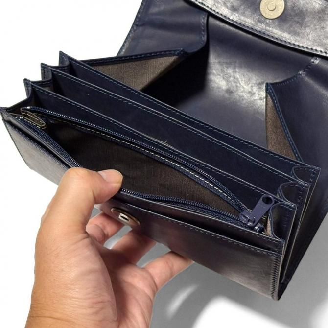 当店のギャルソン財布は、一般的なものよりもひと回り大きめの設計。大きく開くギャルソンポケットで中身が見やすく、小銭もスムーズに出し入れできます。
