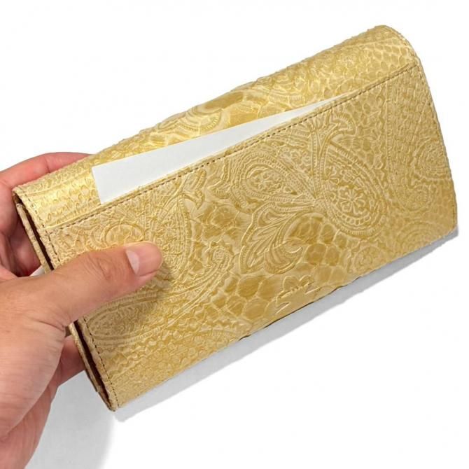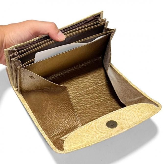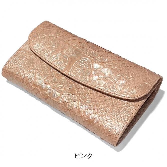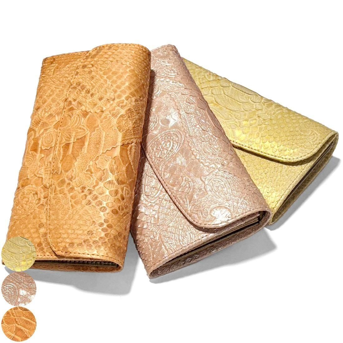 自然が生み出した模様やテクスチャー、他の革素材にはない美しさを持ち、唯一無二の存在感を放つ エキゾチックレザーの一つ、ダイヤモンドパイソン革を使用。 パイソン革にペイズリー柄の型押しで仕上げた珍しいレザーで革全体にあるダイヤ型の連続的なウロコの並びとペイズリー柄の曲線は他にはないラグジュアリーな雰囲気が漂います。 外装・内装の一部にパイソン革を取り入れたデザイン。 天然皮革の風合いや質感を最大限に活かしたものづくりは、他にはない皮革小物専門店ならではの逸品です。 当工房では、革それぞれの特徴や加工、仕上げ、染めを存分に楽しんでいただけるよう、メインとなる革を中心に、パーツごとの機能に合わせた素材選びをしています。そのこだわりの積み重ねにより、使いやすさと長く愛用できる耐久性を兼ね備えたレザーアイテムをお届けしています。